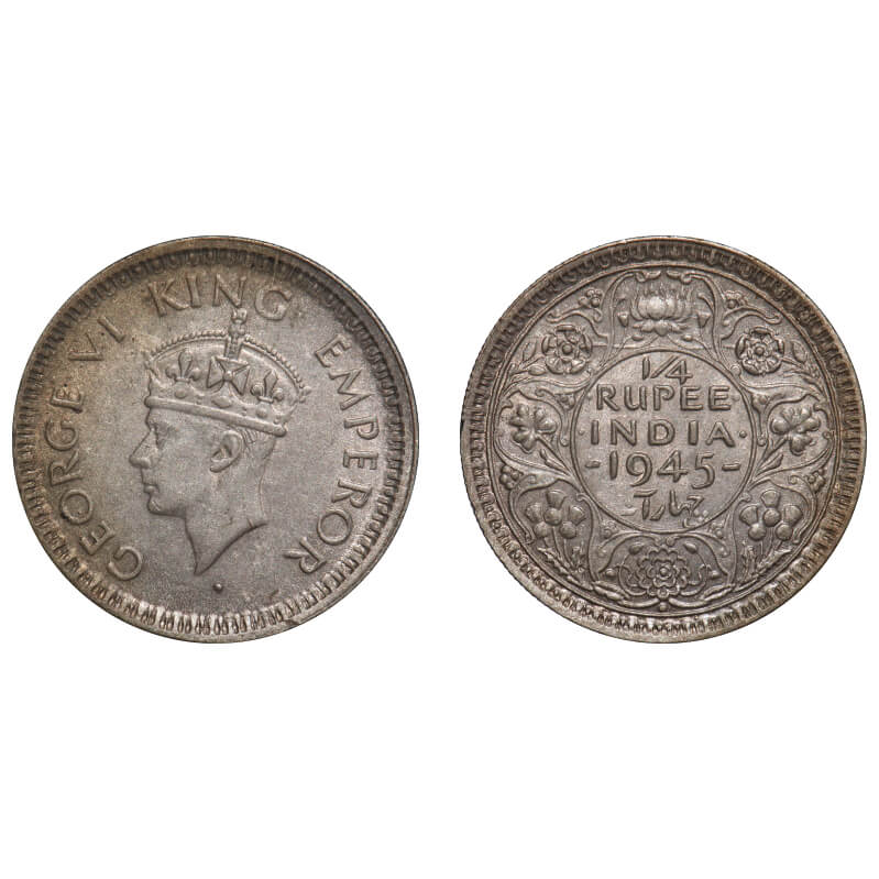 | George VI, Silver, 1/4 Rupee, 1945, Bombay Mint, Dot, Head Type II, Rev II, Security edge, Large 5, Rev lettering w/o serif. F. Prid 470. GK 1343. Almost Uncirculated. Rare. |