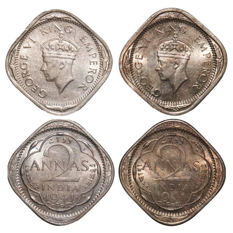 | George VI, Copper-Nickel, 2 Annas, (2 coins), 1941, 1) Bombay Mint, Head Type II, Dots by year, Tiny decorative strokes in the quartrefoil angles thin, 2) Calcutta Mint, Head Type II, No dots by year. F. Prid 916, 907. GK 1355, 1357. Mint State. Very Scarce. |