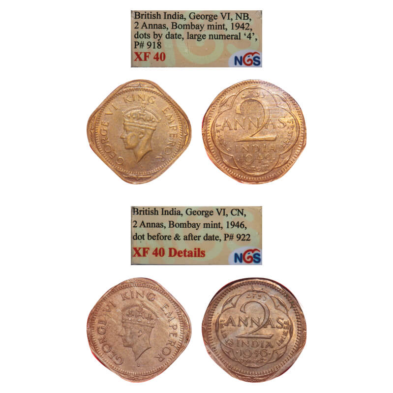 | George VI, Mix-Metal, 2 Annas, (2 slabs), 1) 1942, Nickel-Brass, Bombay Mint, Dots by year, Head Type II, Large numeral 4, 2) 1946, Copper-Nickel, Bombay Mint, Dots by year, Head Type II. F. Prid 918, 922. GK 1359, 1370. NGS Slabbed XF 40, XF 40 Details. Very Scarce. |