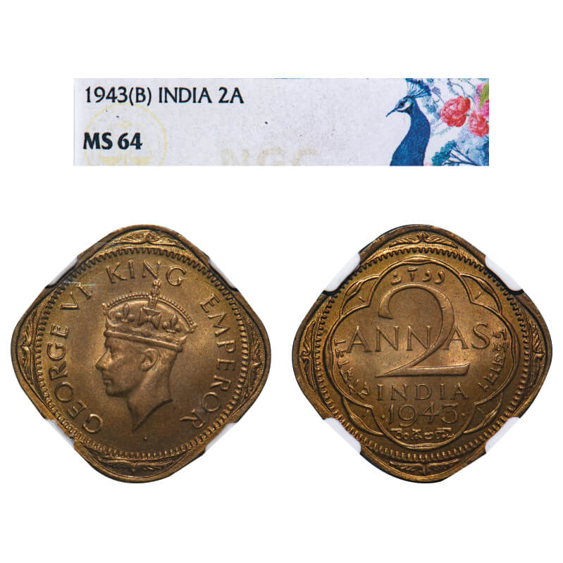 George VI, Nickel-Brass, 2 Annas, 1943, Bombay Mint, Dots by year, Head Type II, Normal & thick numeral 3. F. Prid 919. GK 1360. NGC Slabbed MS 64. Extremely Rare.