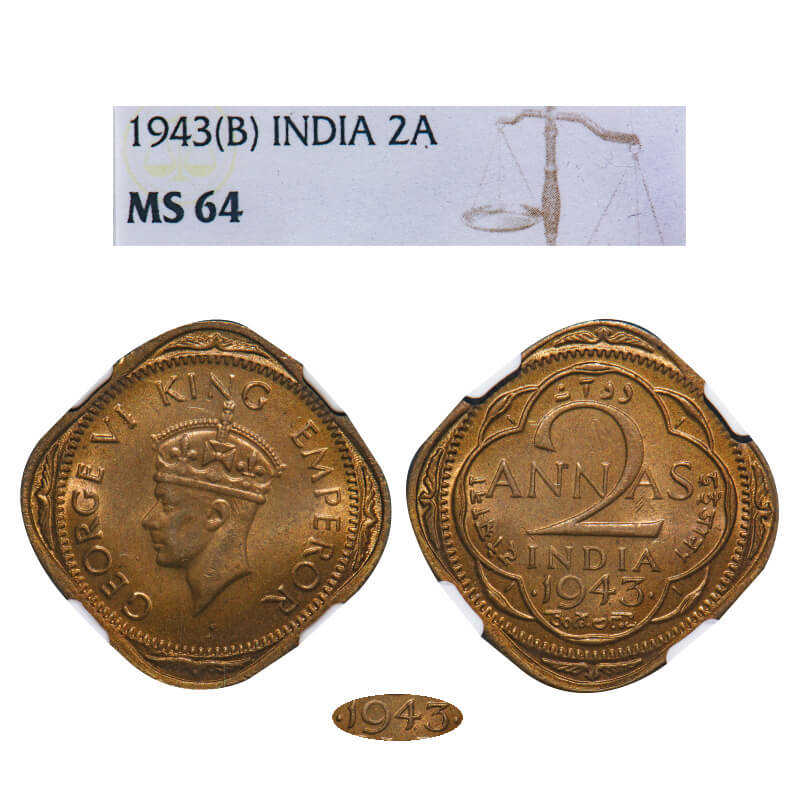 George VI, Nickel-Brass, 2 Annas, 1943, Bombay Mint, Dots by year, Head Type II, Large & Thin numeral 3. F. Prid 919. GK 1361. NGC Slabbed MS 64. Extremnely Rare.