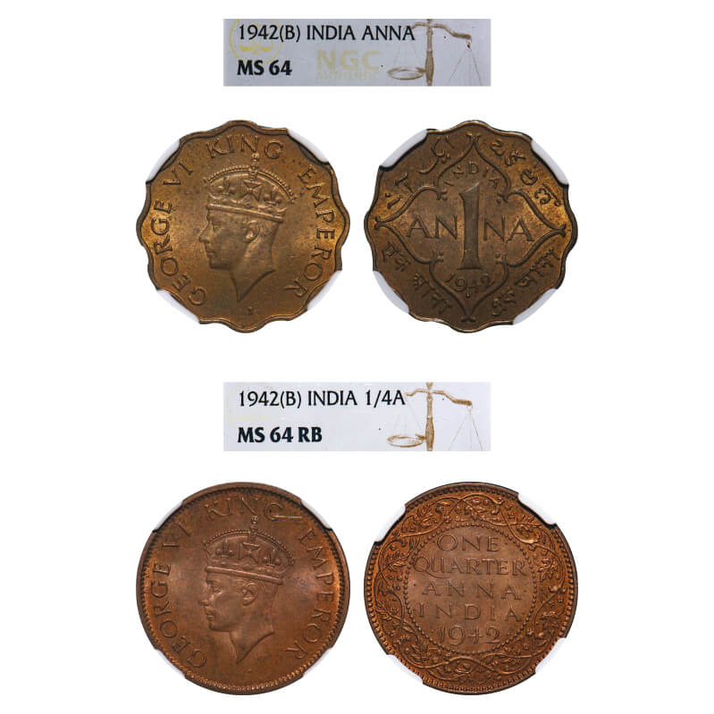 | George VI, Mix-Metal, 1942, (2 slabs), 1) Nickel-Brass, 1 Anna, Bombay Mint, Dot, Head Type II, 2) Bronze, Quarter Anna, Bombay Mint, Dot, Head Type II. F. Prid 976, 694. GK 1388, 1430. NGC Slabbed MS 64, MS 64 RD. Very Rare. |