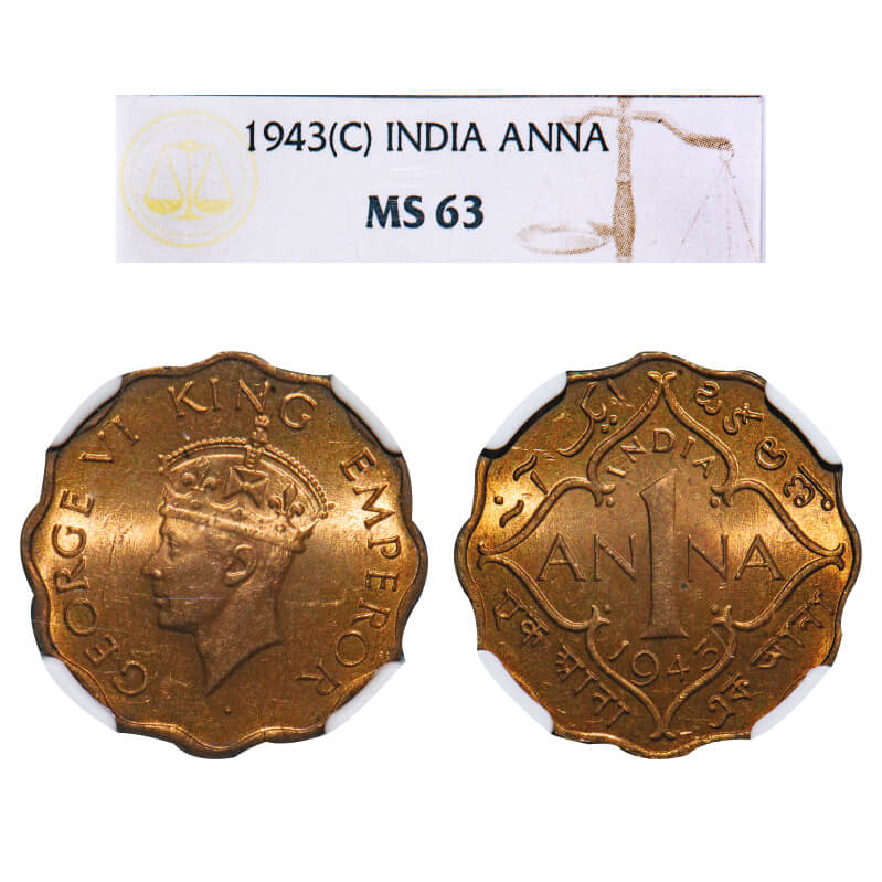 George VI, Nickel-Brass, 1 Anna, 1943, Calcutta Mint, No dot, Head Type II. F. Prid 965. GK 1392. NGC Slabbed MS 63. Very Rare.