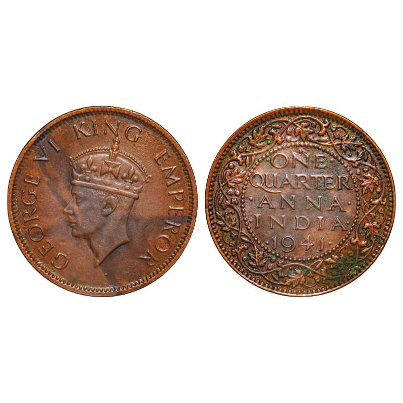 George VI, Bronze, Quarter Anna, 1941, Calcutta Mint, No dot, Head Type II. F. Prid 687. GK 1429. N...