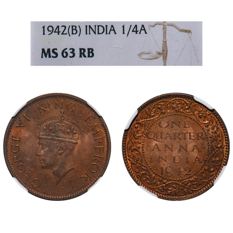 George VI, Bronze, Quarter Anna, 1942, Bombay Mint, Dot, Head Type II. F. Prid 694. GK 1430. NGC Slabbed MS 63 RB. Very Rare.