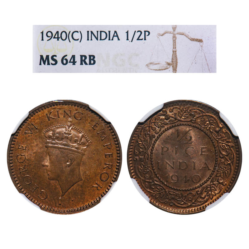 George VI, Bronze, 1/2 Pice, 1940, Calcutta Mint, No dot, Head Type I. F. Prid 772. GK 1452. NGC Slabbed MS 64 RB. Rare.