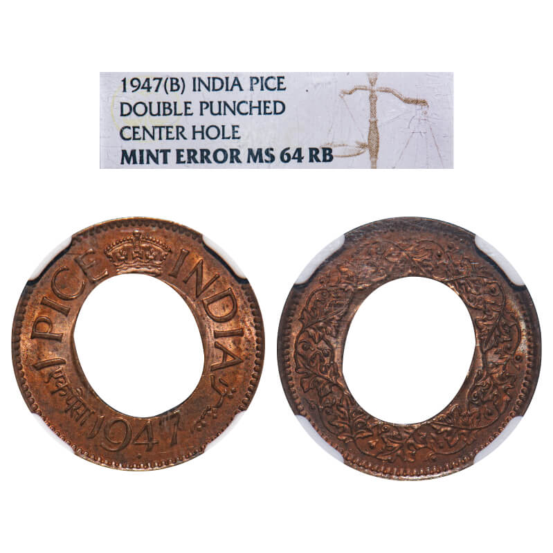 | George VI, Bronze, 1 Pice, 1947, Bombay Mint, High Crown, Diamond, Mint Error, Double punch centre hole mentioned on the slab (due to the punch the round shaped centre hole looks like oval shape). F. Prid 704. GK 1447. NGC Slabbed MS 64 RB. Very Rare. |
