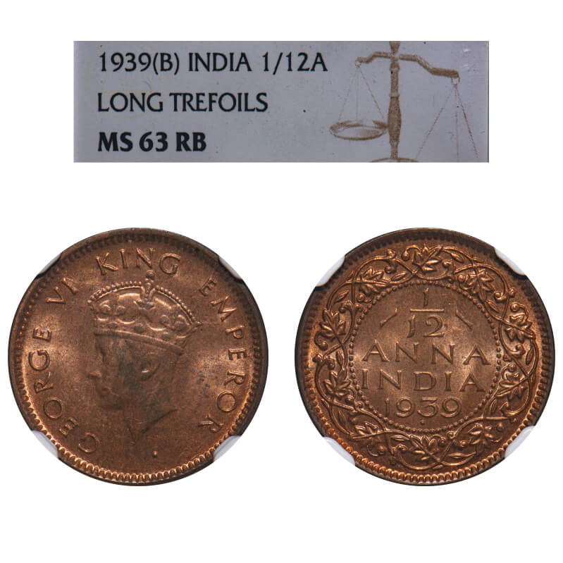George VI, Bronze, 1/12 Anna, 1939, Bombay Mint, Dot, Head Type I. F. Prid 860. GK 1453. NGC Slabbed MS 63 RB. Very Rare.