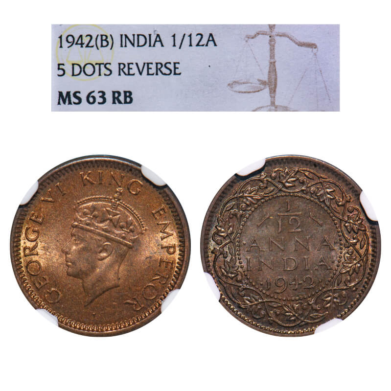 George VI, Bronze, 1/12 Anna, 1942, Bombay Mint, Dots by year, Head Type II. F. Prid 863. GK 1458. NGC Slabbed MS 63 RB. Very Rare.
