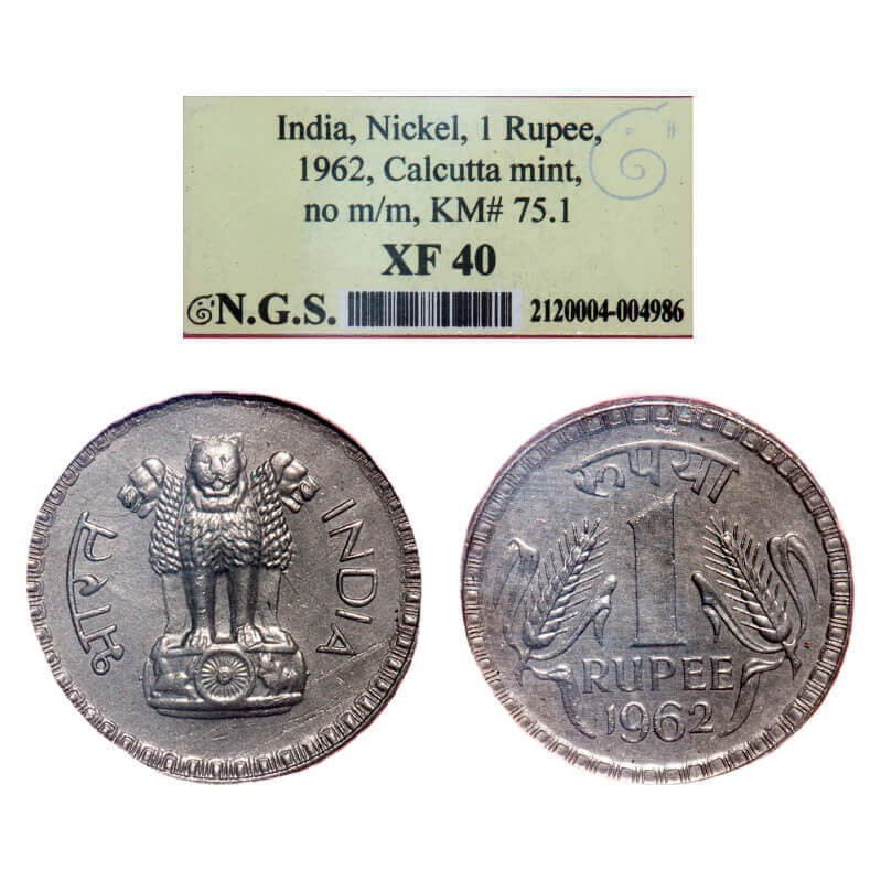 1 Rupee, 1962, Nickel, 9.99g, Calcutta Mint. KM 75.1. NGS graded XF 40. Scarce.