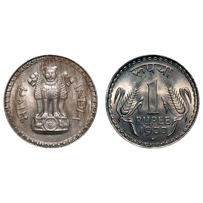 1 Rupee, 1977, Cu-Nic, 8.00g, Mule, obv of 1976 re with short teeth on obv and w/o central lion chest hair re engraved. rare to find in mint grade. Toned Uncirculated, Very Scarce.