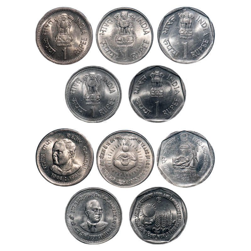 | 1 Rupee, Cu-Nic (5 Coins), 1) 1989-World Food Day, Noida Mint, 2) 1991-Rajiv Gandhi, Noida Mint, 3). 1990- Dr B R Ambedkar, Bombay Mint, 4) 1990-15 Years of I.C.D.S, Bombay Mint, 5) 1992-Food and Nutrition, Calcutta Mint, Uncirculated, Scarce. |