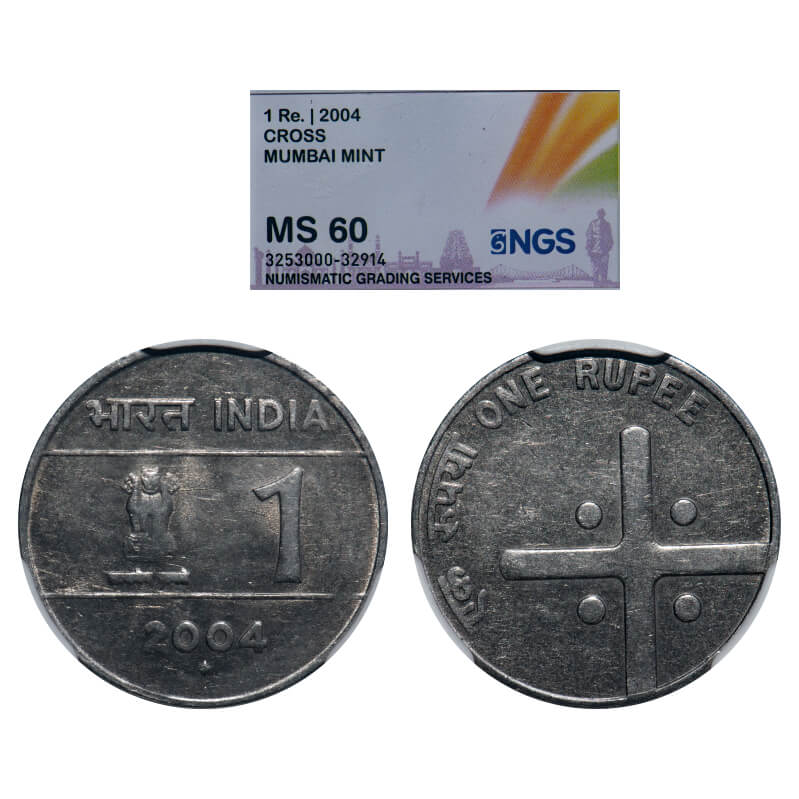 1 Rupee, 2004, FSS, Cross, Mumbai Mint. NGS graded MS 60. Scarce.