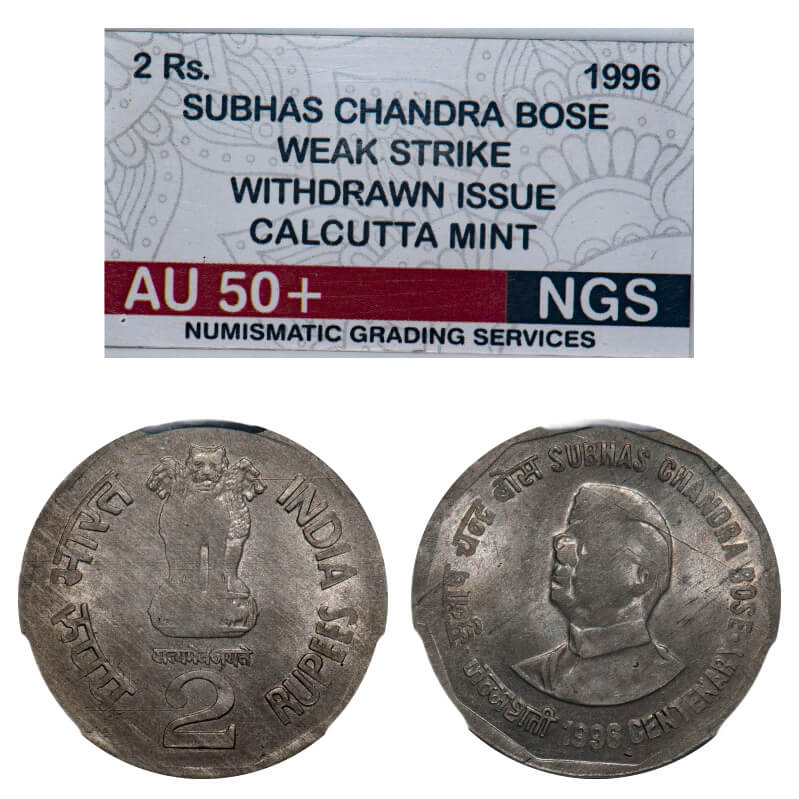 2 Rupees, 1996, Copper Nickel, Calcutta Mint, Netaji Subhash Chandra Bose Centenary. weak strike, withdrawn issue, NGS graded AU 50+, Rare.