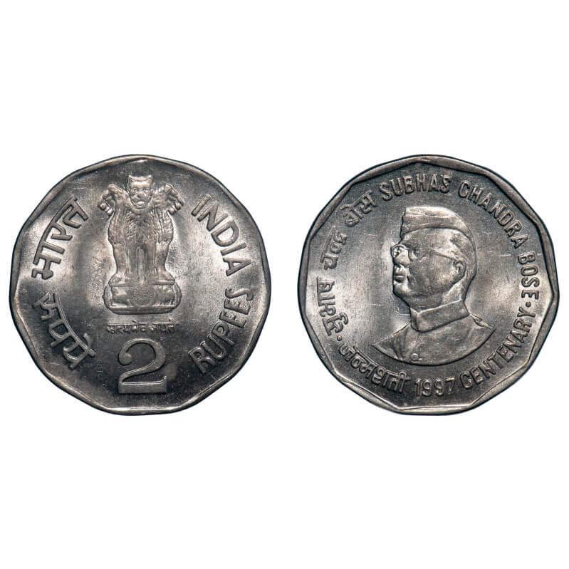 2 Rupees, 1997, Copper Nickel, 6.15g, Calcutta Mint, Netaji Subhash Chandra Bose Centenary, Obverse D type lion variety Uncirculated, Rare.