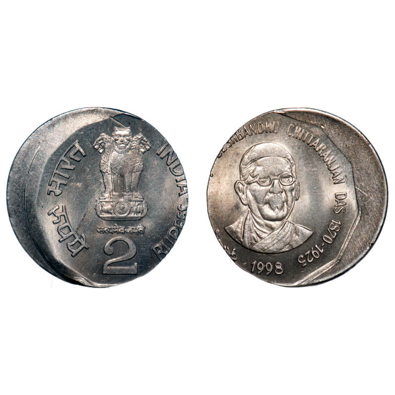 2 Rupees, 1998, Cu-Ni, 5.72g, Desh Bandhu Chittranjan Das, Calcutta Mint, 20 % misalingned die Error. About Uncirculated, Scarce.