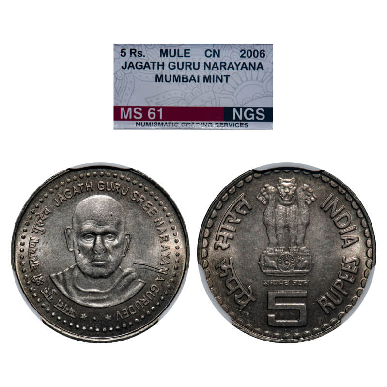 5 Rupees, 2006, Cu-Nic, Jagat Guru Narayan, Mumbai Mint, Mule. NGS graded MS 61, Extremely Rare.