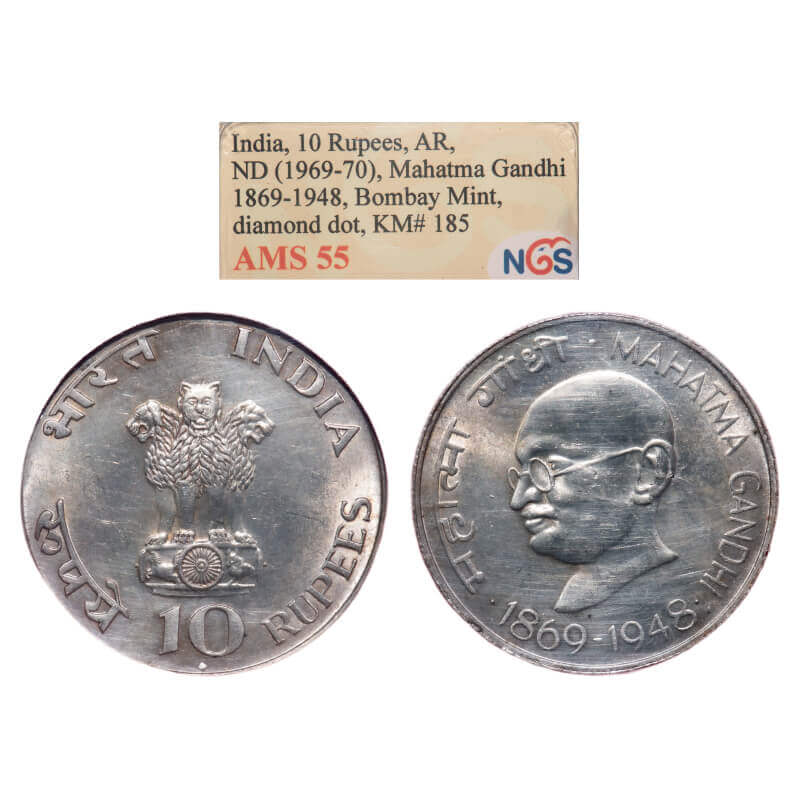 10 Rupees, 1969, Silver (80%), Mahatma Gandhi Centenary (1869-1948), Bombay mint. NGS slabbed AMS 55. RB 18. Very Scarce.
