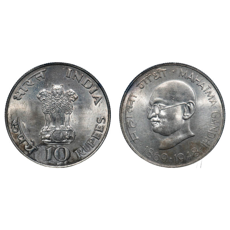 10 Rupees, 1969, Silver (80%), 15.00g, Mahatma Gandhi Centenary (1869-1948), Bombay mint. RB 18. Un...