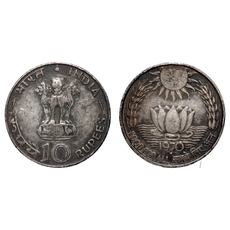 10 Rupees, 1970, Silver (80 %), 14.95g, Food For All (F.A.O Series) 25th Anniversary, Bombay Mint. Very Fine, Scarce.