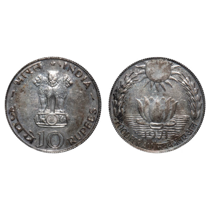 10 Rupees, 1970, Silver (80 %), 14.95g, Food For All (F.A.O Series) 25th Anniversary, Bombay Mint. ...