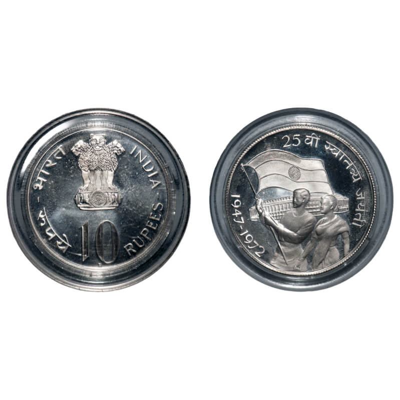 10 Rupees, 1972, Silver Proof, 25th Anniversary of Independence, Bombay Mint, in Acrylic case, with original Paper Mint Envelope, only 3655 pcs minted. Proof. Rare.
