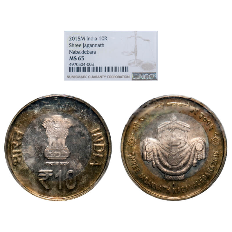 10 Rupees, 2015 (2 slabs), Bimetal, Shree Jagannath Nabaklebara , Mumbai Mint, 1) M mint mark, Obv ...