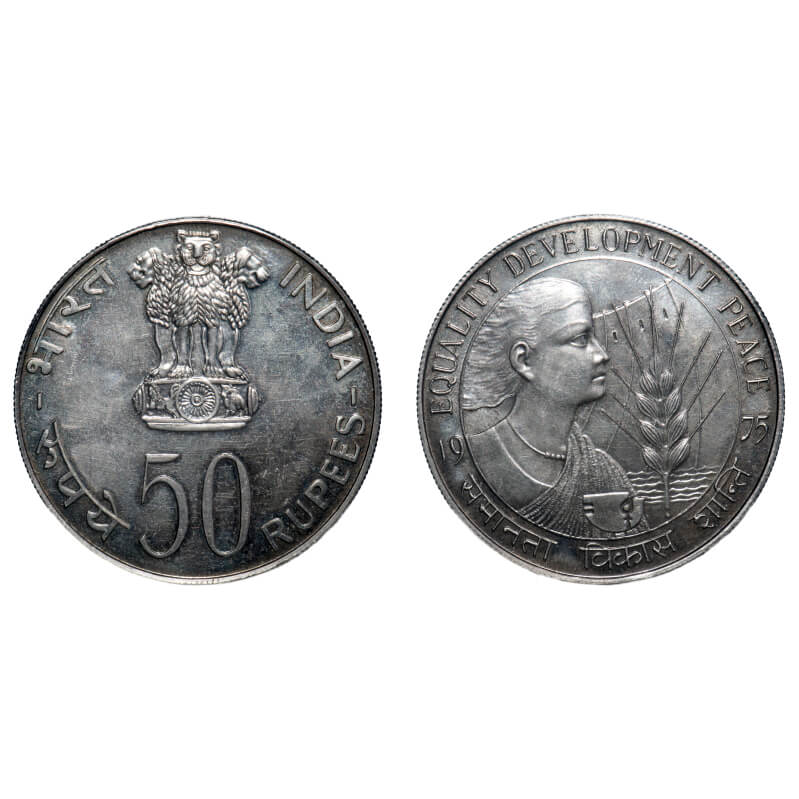 | 50 Rupees, 1975, Silver (50%), 34.74g, Unc, loose, Equality Development Peace, Bombay Mint. Uncirculated, Scarce. |