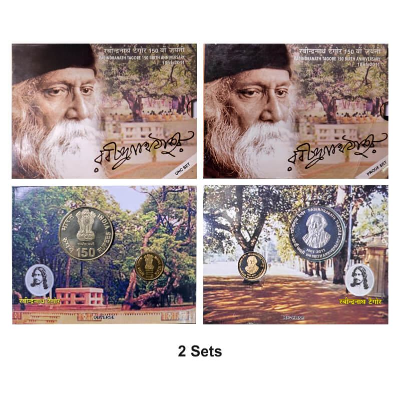 2010, Proof and Unc Set of 2 Coins, 150 & 5 Rupees (2), Rabindranath Tagore 150th Birth Centenary (1861-2011), Kolkata Mint. in original mint blister packing. S.Reddappa 25.65. Proof & UNC, Scarce.