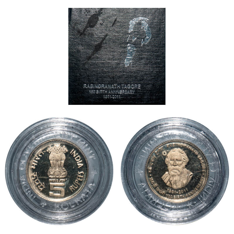 2010, Proof and Unc Set of 2 Coins, 150 & 5 Rupees (2), Rabindranath Tagore 150th Birth Centenary (...