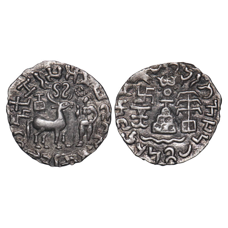 | Kunindas, Amoghabhuti (c. 200 BC), Silver Drachma, 2.31g, 17.12x16.61mm, Obv: Deer standing to right early Srivatsa symbol between its horns and rectangular vase above, goddess standing holding a Lotus, 'Sun' symbol behind the deer legs at 8'o clock embedded in Brahmi legends, 'Rajnya Kunindasa Amoghabhutisa Maharajasa’, Rev: Six arched hill (chaitya) with parasol above nandipada (Triratna), river symbol below, tree-in-railing, split indradhavaja & swastika above, Kharoshthi legend 'Maharaja Amoghabhutisa’, sharply striked. Extremely Fine, Rare. |