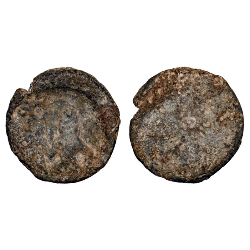 | Post-Mauryan, Ujjaini Region, Uninscribed type, Lead Unit, 2.71gm, 12.61x12.51mm, Obv: Mahakal standing holding object on left side sun standard and traces of other symbols, Rev: Worn out. Unlisted in Pieper. About Very Fine, Details, Scarce. |