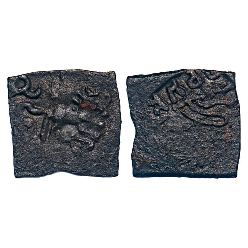 | Post Mauryan, Ancient city-state of Agroha (Agacha), Haryana region of North India (200 - 100 BC), Copper Unit, 1.09gm, 13.50x13.69mm, Obv: Lion facing right, counter-struck with an uncertain device, Brahmi legend '(JANA)PADASA' on left, Rev: Brahmi legend 'AGACHA JA(NPADA)' counter-struck over an uncertain device . About Extremely Fine, Very Rare |