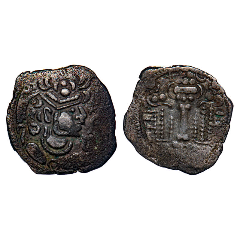 | Indo-Sassanian, Anonymous Issue, Rajasthan Region, Silver Drachma, 3.87gm, 23.38x21.90mm, Obv: Crowned bust of king facing to right, Rev: Fire altar flanked by attendents. Very Fine, Scarce., Scarce. |