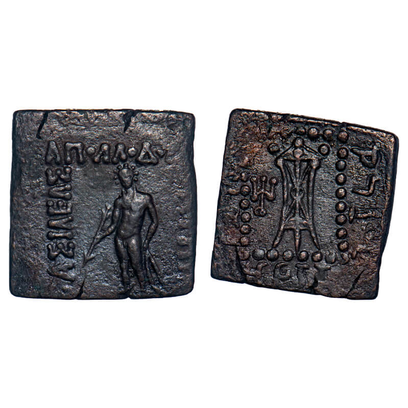 | Indo-Greeks, Apollodotus I, Square Copper Quadruple Unit, 10.67gm, 24.26x23.79mm, Obv: Apollo standing facing left, with quiver over shoulder, holding arrow in right hand and left hand resting on grounded bow with Greek legend ‘BASILEOS APOLLODOTOY SOTHPOS’, Rev: Tripod within dotted square with monogram and Kharoshthi legend. Bopearachchi & Rahman # 206. Very Fine+, Scarce. |