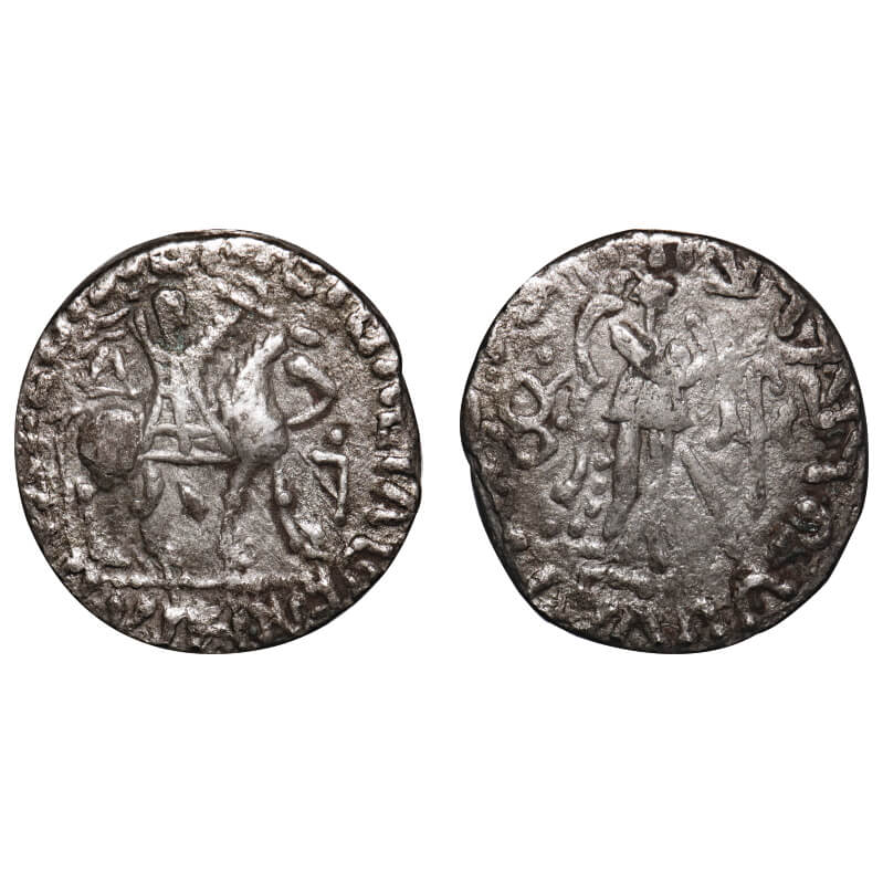 | Indo Scythian, Apracha Rajas of Bajaur, Vijayamitra, (12 BC to 20 AD), Silver Tetradrachm, 8.77 gms, 22.59x21.53mm, Obv. King on horseback to right holding whip Greek legends around, Rev. Pallas standing, holding long spear and small shield, nandipada to left, monogram to right, Senior #175.241, very fine, very rare. Note: Vijayamitra was an Apracha king who ruled in Gandhara, with his capital in Bajaur, from approximately 12 BC to 20 CE. As a significant supporter of Buddhism, he dedicated a Buddhist reliquary, known as in the Shinkot casket, and some of his coins feature the Buddhist Triratna symbol. He succeeded his predecessor Visnuvarma and was followed by his son, Indravasu. |