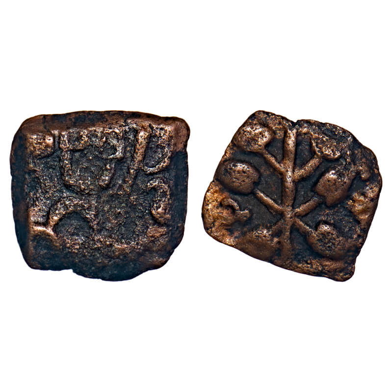 | Maharathis, Siva Vijha Sati, Marathwada - Western Vidarbha region of Maharashtra (c.150 - 100 BC), Copper, 1.41gm, 11.70x12.47mm, Obv: Three arch hill with crescent above, complete Brahmi legend 'SIVA VIJHA SATI' above, Rev: Tree with bold leaves in railing. Similar to Pieper # 2528. Very Fine, Scarce. |