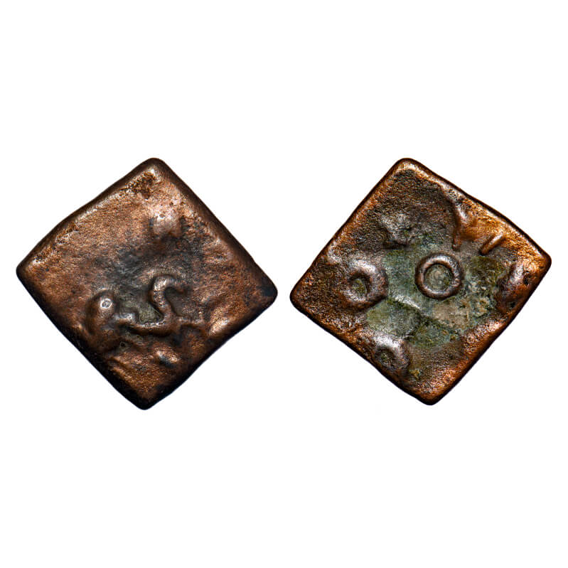 | Satavahanas, Siri Satakarni, Vidarbha Region, Copper Unit, 3.18gm, 15.14x14.56mm, Obv: Elephant walking to right side with trunk upraised, Rev: Four orbed ujjaini symbol with Brahmi legend mentioning the ruler name. Very Fine, Scarce. |