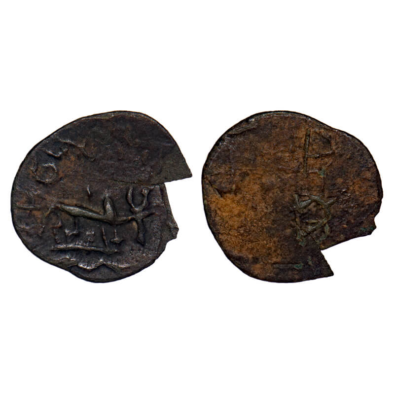 Post Satavahanas, Kadambas of Banvasi Region, Potin Unit, 0.83gm, 16.06x17.81mm, Obv: Bull walking to right below wavy line and above crude Brahmi legend, Rev: bow and arrow. Pieper # 2119. Very Fine, Scarce.
