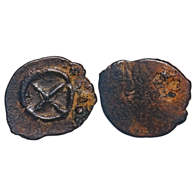 Post-Satavahanas, Kadambas of Banvasi Region, Potin Unit, 0.49gm, 1206x14.04mm, Obv: Four spoked chakra, Rev: Blank. Pieper # 2128. Very Fine, Scarce.