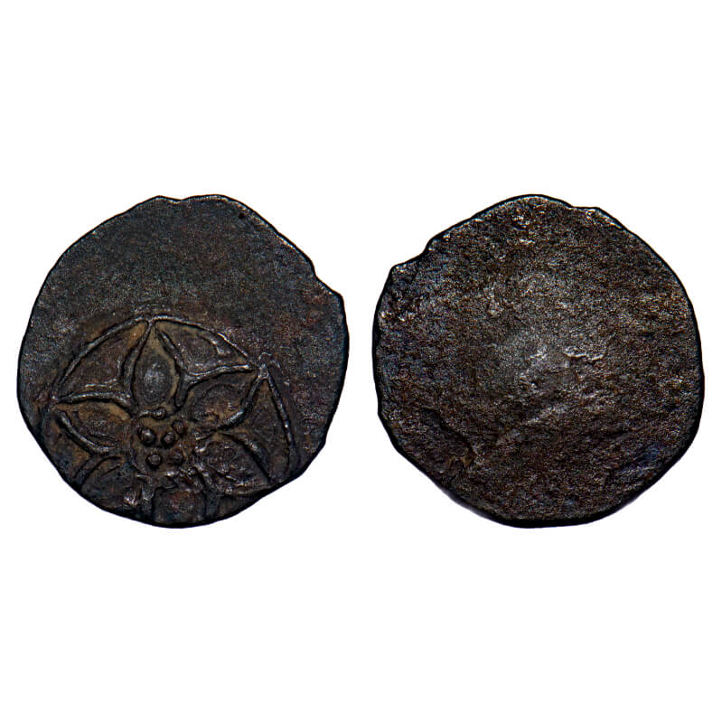 Post-Satavahana, Kadambas of Banavasi, Potin Unit, 0.66gm, 13.14x12.93mm, Obv: Six petalled lotus, Rev: Blank. Pieper # 2133.