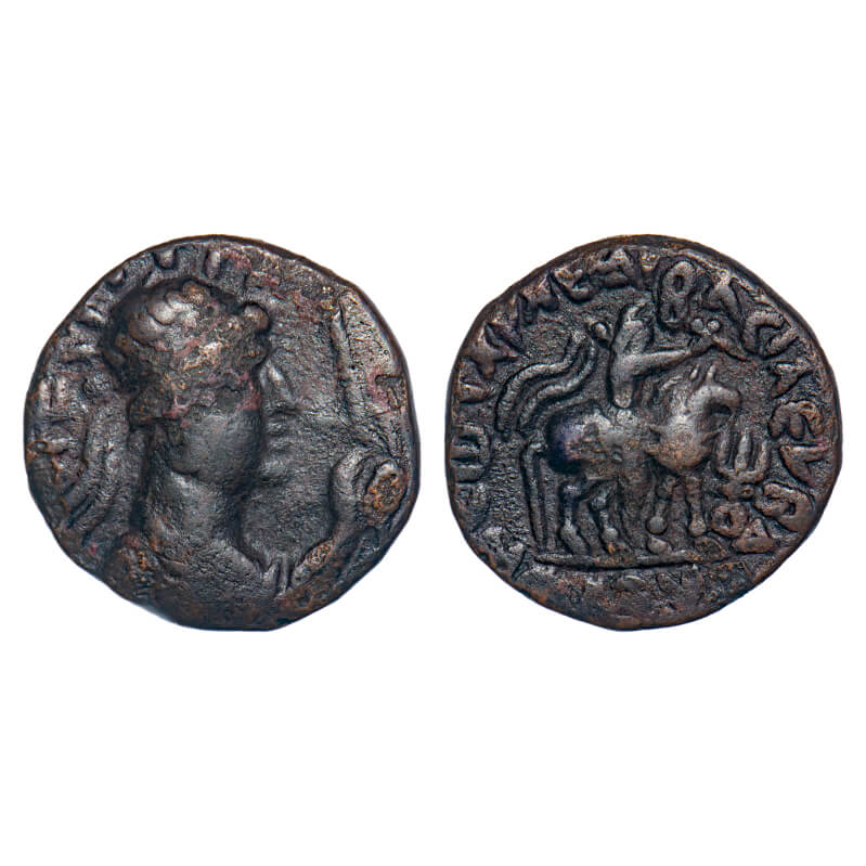 Kushan Dynasty, Kujula Kadphises (c. 50-90 AD), Copper Drachma, 3.59gm, 16.73x17.62mm, Obv: Humped ...
