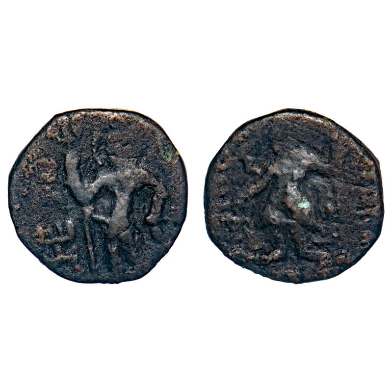 | Kushanas, Kanishka I (c. 127-158 AD), Copper 1/4 Drachma, 3.76gm, 16.59x16.53mm, Ithyphallic Siva type, Obv: King standing facing head left holding standard, sacrificing over altar and around Greek legend, Rev: Two armed ithyphallic siva holding trident and water pot respectively, tamgha on left and label OHPO on right side. Pieper # 1767. About Very Fine, Scarce. |