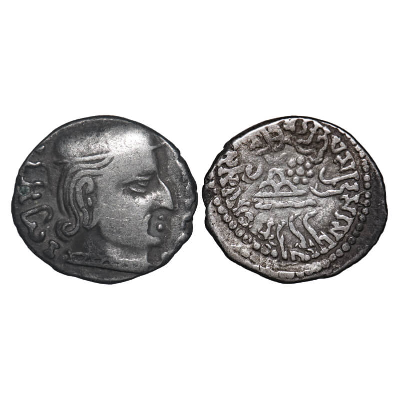 | Western Kshatrapas, Kardamaka Family, Samghadaman, son of Rudrasimha I, (227 AD), as Kshatrapa, SE 149, Silver Drachma, 2.20gm, 14.64x16.09mm, Obv: bust of king facing right, date behind, corrupt Greek legend around, Rev: three arched hill with crescent in centre, moon to left and sun to right, Brahmi legend in hybrid Prakrit-Sanskrit: Rajno Mahakshatrapasa Rudrasihasaputrasa Rajno Kshatrapasa Saghadamna. The ephemeral ruler Sangadaman or Samghadama is known to have struck coins only in SE 149 when he assumed the titles of Mahakshatrapa. These coins of SE 149 are also considered as great rarity in Kshatrapa coinage. He was one of the five sons of mighty Rudrasimha I, perhaps fourth or fifth in the order. A. Fishman 19.1.149. About Extremely Fine, Extremely Rare. |