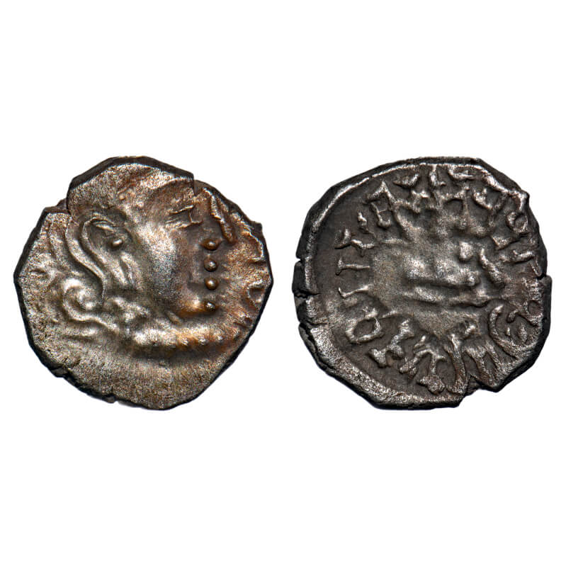 | Guptas, Skandagupta (c. 455-480 AD), Seated bull Type, Silver Drachma, 1.86gm, 12.76x12.61mm, Obv: Bust of king facing to right, Rev: Brahmi legend ‘(Paramabhagavata maharajadhiraja) sri skandagupta kramaditya’ around the cental motif of a Nandi Bull to right. Pieper # 3601. Extremely Fine, Scarce. |