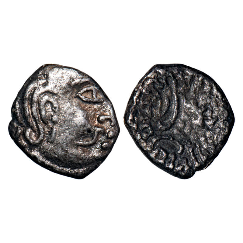 Kalachuris of Mahishmati, Krishnaraja (c. 550-575 AD), Silver Drachma, 1.61gm, 12.26x10.79mm, Obv: Bust of king facing to right side, Rev: Seated bull facing to right around Brahmi legend. Mitch #ACW 5093. Very Fine, Scarce.