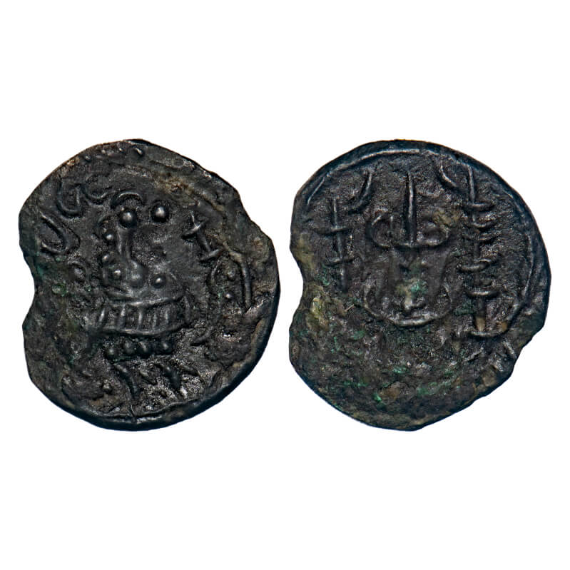 | Eastern Chalukyas of Vengi, Vishnuvardhana I, Copper Base Alloy Unit, 1.56gm, 15.30x13.92mm, Vishnukundin Type, Obv: Roaring lion walking to right front of srivatsa, Brahmi legend above lion Rev: Bold srivatsa between two tridents within rays circle. Very Fine+, Scarce. |
