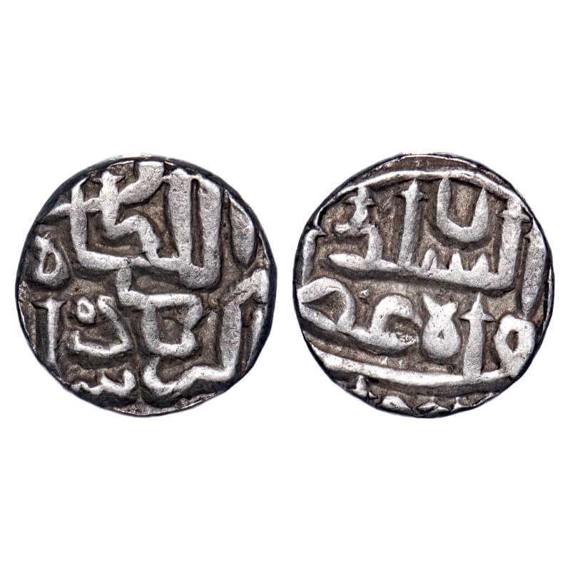 | Gujarat Sultanate, Silver 1/2 Tanka, 5.74g, Shams Al Din Muzaffar II & Akbar, (AH 917-932 / 1511-1525 AD) mughal occupation under Akbar, (AH 991), Obv. Al sultan akbar bad shah, Rev. Al - Sultan al - a zam nasir al - dunya wa i din abu I fath (muhmud I legend). G&G G645 Type. Very Fine+, Rare. |