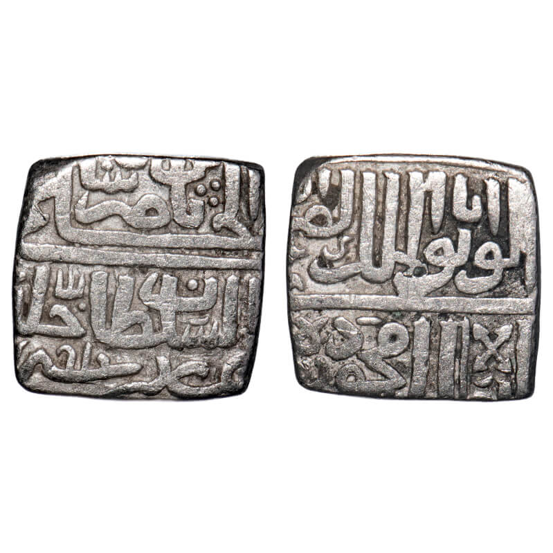 | Malwa Sultanate, Silver 1/2 Tanka, 10.12, Mahmud Shah II (AH 916-937 / 1510-1531 AD), Mintless Type, AH 923, Al wathiq al samad, abul muzaffar type, cross symbol. G&G M156 type. About Very Fine, Scarce. |