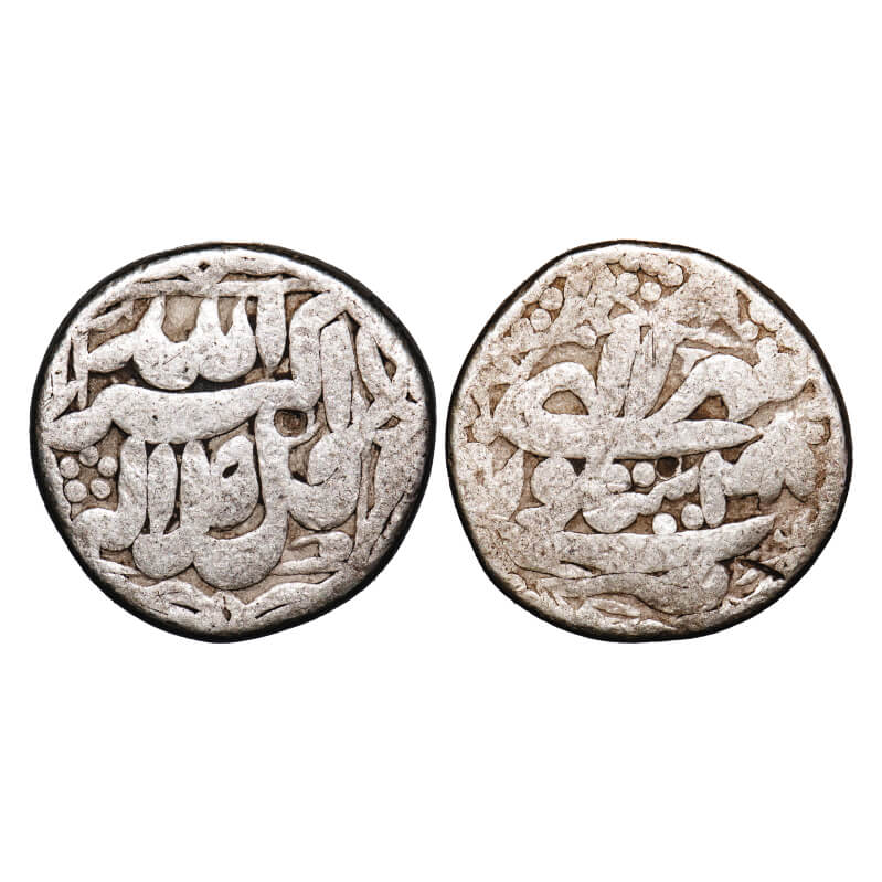 Akbar, Silver Rupee, 11.02g, Sitpur Mint, Ilahi type, Month 'Mihir', Ilahi 48, with ornamental borders on both sides. KM 94.4. Fine, Scarce.